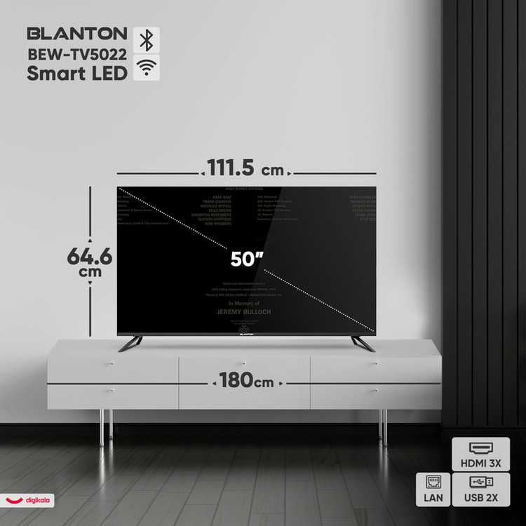 تلویزیون 50 اینچ بلانتون مدل BEW-TV5022 یک گزینه جذاب و کاربردی برای خانههای امروزی است. این تلویزیون با کیفیت تصویر4K و رزولوشن 3840×2160، تصاویری شفاف و زنده تولید میکند. جزئیات تصویر کاملاً واضح هستند و تماشای فیلم و برنامههای مورد علاقهتان با آن لذتبخش میشود. نسبت تصویر 16:9 و پنل VA باعث میشود که رنگها طبیعی و عمق تصویر بالا باشند. نرخ بهروزرسانی تصویر 60 هرتز است و تصاویر با سرعت مناسب و بدون پرش نمایش داده میشوند. نور پسزمینه DLED هم کیفیت تصویر را در محیطهای مختلف به خوبی حفظ میکند. از نظر صدا، این تلویزیون با توان خروجی 20 وات و فناوریهای Dolby Digital و DTS صدایی واضح و فراگیر پخش میکند. حتی بدون استفاده از اسپیکرهای جانبی هم میتوانید از کیفیت صدای خوب آن لذت ببرید. خروجی صدای اپتیکال هم برای اتصال به سیستمهای صوتی حرفهای در نظر گرفته شده است. بلانتون BEW-TV5022 یک تلویزیون کاملاً هوشمند است. سیستم عامل Android نسخه 11 روی آن نصب شده است و به شما امکان میدهد به اینترنت وصل شوید، برنامههای مختلف را اجرا کنید و حتی از مرورگر وب استفاده کنید. این تلویزیون از وایفای، بلوتوث و قابلیتScreen Mirroring پشتیبانی میکند و کنترل آن با ریموت هوشمند بسیار ساده و راحت است. ریموت کنترل این مدل در عین حال قابلیت استفاده از موس هم دارد و کار شما را آسان میکند تا روی صفحه راحتتر جابجا شوید. این تلویزیون دارای سه درگاه HDMI و دو درگاه USB است که برای اتصال دستگاههای مختلف مثل کنسول بازی، فلش مموری و لپتاپ مناسباند. درگاه LAN هم برای اتصال مستقیم به اینترنت در نظر گرفته شده است. گیرنده دیجیتال داخلی به شما امکان میدهد شبکههای تلویزیونی را بدون نیاز به دستگاه اضافه دریافت کنید. از دیگر امکانات کاربردی این تلویزیون میتوان به جدول پخش برنامهها، قابلیت Time Shift، قابلیت ضبط برنامه، تلهتکست و منوی فارسی اشاره کرد. همه این قابلیتها باعث میشوند که استفاده از تلویزیون برای همه اعضای خانواده ساده و لذتبخش باشد. تلویزیون بلانتون 50 اینچ طراحی ساده و مدرنی دارد. صفحه تخت با پایههای دو شاخه ظاهر زیبایی به آن بخشیده است. ابعاد این مدل بدون پایه 1115x646x95 میلیمتر است و وزن آن حدود 9.68 کیلوگرم است.