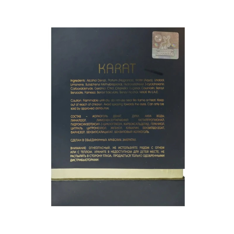 ادکلن “کارات Karat” از برند “الحمبرا Alhambra” یک انتخاب مناسب و جذاب برای هر فصلی است. این ادکلن با رایحههای شیرین و میوهای، مشابه ادکلن “تیزیانا ترنزی کیرکه Tiziana Terenzi Kirke” میباشد.