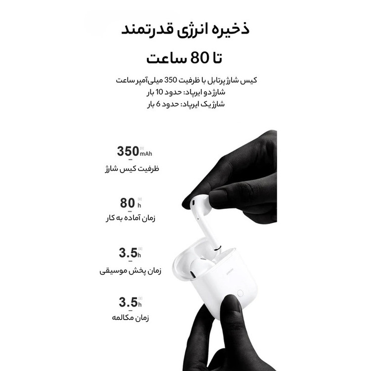 قابلیت شارژ کابلی و بی سیم است و شما میتوانید از تلفن های همراه دارای پشتیبانی از شارژ وایرلس دستگاه های جانبی همانند ساعت هوشمند و هندزفری های وایرلس نیز برای شارژ استفاده کنید و نیز میتوان به صورت بلعکس گوشی را نیز توسط این محصول شارژ کرد. مدت زمان لازم برای شارژ کیس با کابل یک ساعت و بی سیم سه ساعت می باشد.ظرفیت باطری کیس چهارصد میلی آمپر و ظرفیت باطری هر سری هندزفری چهل و پنج میلی آمپر است. میزان عمر باطری برای استفاده مداوم در پخش موزیک و تماس تلفنی 3/5 ساعت و در حالت (استندبای) عدم استفاده 8 ساعت است که این محصول را در میزان عمر باتری به محصول قابل توجهی برای خریداران تبدیل شده است. با این محصول می توان به تمام دستگاه های دارای پشتیبانی از بلوتوث متصل شود. ورژن بلوتوث این محجصول پنج می باشد.همزمان با باز شدن درب کیس، گوشی به دستگاه اپل متصل و لوگوی اتصال و اطلاعات باطری باقی مانده در صفحه موبایل های اپل ظاهر می شود. این محصول دارای قابلیت لمسی برای برقراری تماس تلفنی و پشتیبانی از تمامی دستیار های صوتی از جمله دستیار سیری (اپل), گوگل, الکسا(آمازون), کورتانا(مایکروسافت) و نیز تمام دستیار های صوتی است.